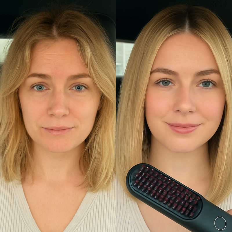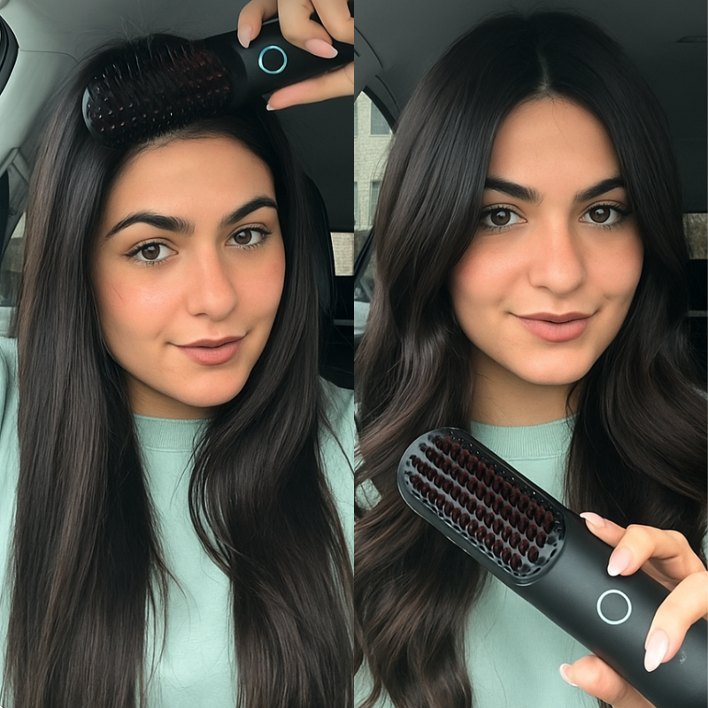 Avant, ses cheveux manquaient de forme et d’éclat. Grâce à la brosse sans fil RyshGoHair, elle obtient en quelques gestes une chevelure lisse avec de légères ondulations naturelles. Compacte, USB rechargeable et sans fil, elle est idéale pour les femmes pressées — même dans la voiture !